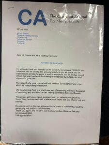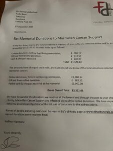 Confirmation of more than £3300 for Macmillan Cancer Support in honour of our choir’s late accompanist, Liz Sidebotham. And below, letter of thanks from Derriford to Halfway Harmony